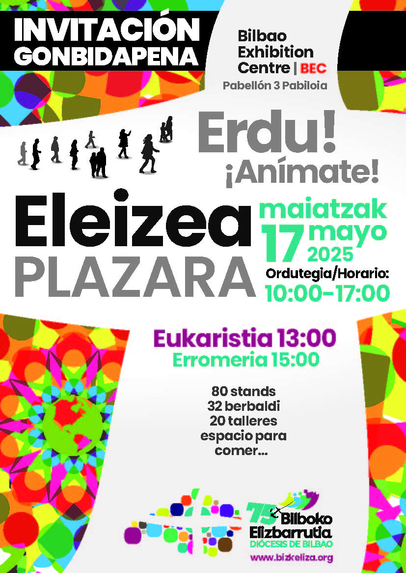 Datorren maiatzaren 17an ospatuko da Bilboko Eleizbarrutiaren sorreraren 75. urteurreneko ekitaldi nagusia "Eleizea plazara" azokagaz. Aurreikuspenen arabera, milaka lagun batuko da, eleizbarrutiari lotutakoak ala ez, pastoral, gizarte eta ospakizun arloko jarduera ezagutzeko. Goizeko 10:00etan hasita, BECeko 3. pabiloian jarriko dabezan standak -80 inguru- bisitateko aukera izango da. Tailerrak be egingo dira, kapera izango da, txikigunea, klausurako monasterioetako gozokiak salduko dabez, eszenatokian etenbarik izango dira emonaldiak eta ez da ezustekorik faltako. Gotzaina buru dala osptuko dan Eukaristia 13:00ean izango da eta eskaut taldeak girotutako erromeriak emongo deutso amaiera egunari.