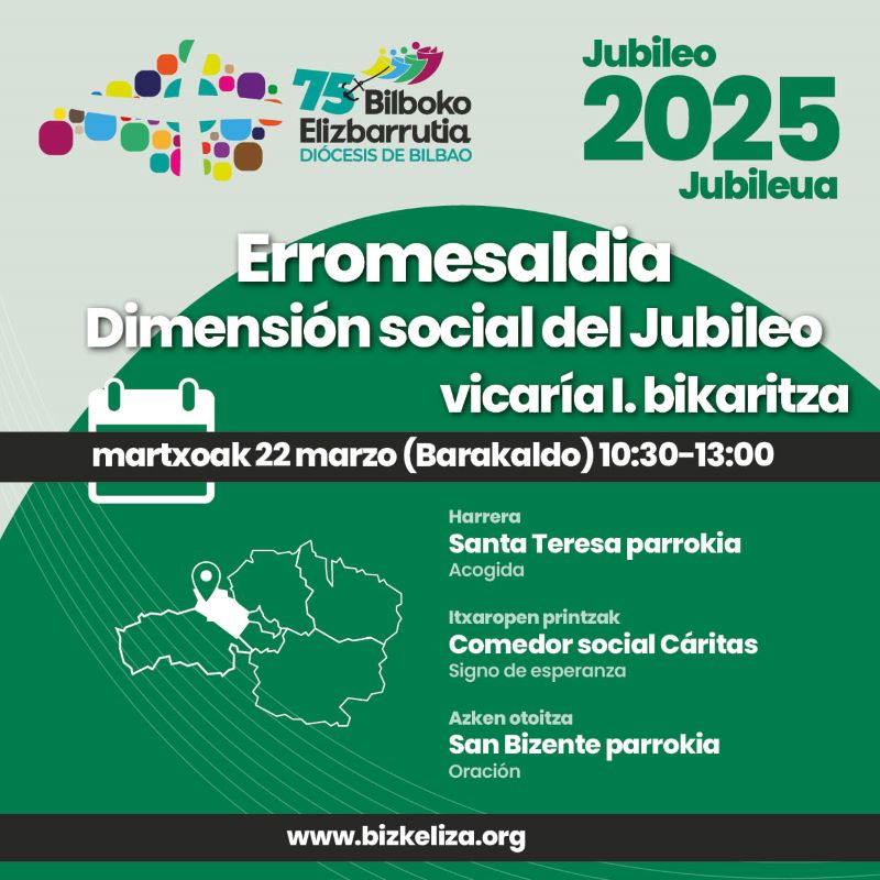 Datozan hilabeteetan, lurraldeko hainbat lekutan agertuko da Jubileuaren gizarte alderdia, gura dauana "erromes joan daiten eta konpromiso eta itxaropenezko keinua egin daian". Eleizbarrutiak lagungarriak argitaratu ditu Jubileuaren gizarte alderdia bikaritzaz bikaritza aurkezteko: hemen.