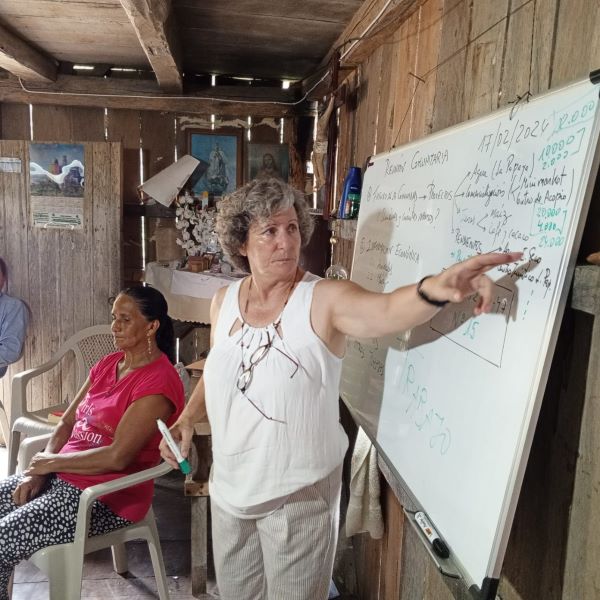 Isa Matilla en una reunión comunitaria en Estero Seco (Jama)