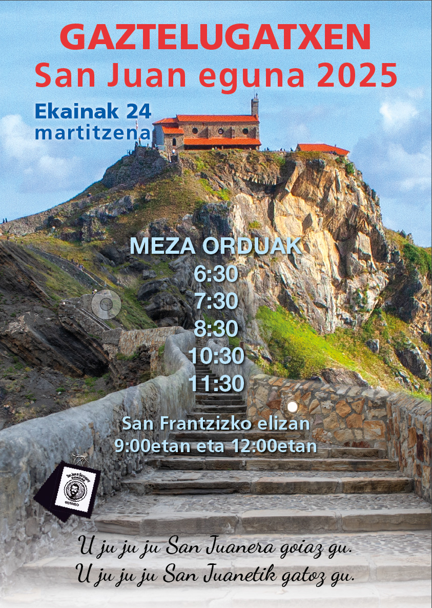 Bihar -ekainak 24, martitzena, San Joan Bateatzailearen eguna ospatuko da. Bizkaian, Gaztelugatxen dago santu horren izena daroan ermita bat eta bertan, goizean goizetik hasita, hainbat Eukaristia ospatuko da: 06:30, 07:30, 08:30, 10:30, 11:30 eta 12:30etan. Beste batzuetan lez, ermitaraino joaterik ez dabenek eskatuta, Bermeoko San Frantzisko parrokian be Eukaristia bi ospatuko dira, 9:00etan eta 12:00etan.
