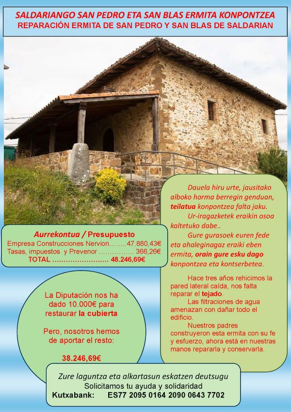 Con ese motivo, desde San Pedro y San Blas y Santa Krutze, piden colaboración para sufragar los gastos a vecinos de Saldarian, de Ugao-Miraballes y a todo amante de la ermita, a través de un ingreso en la siguiente cuenta: Kutxabank ES77 2095 0164 2090 0643 7702.